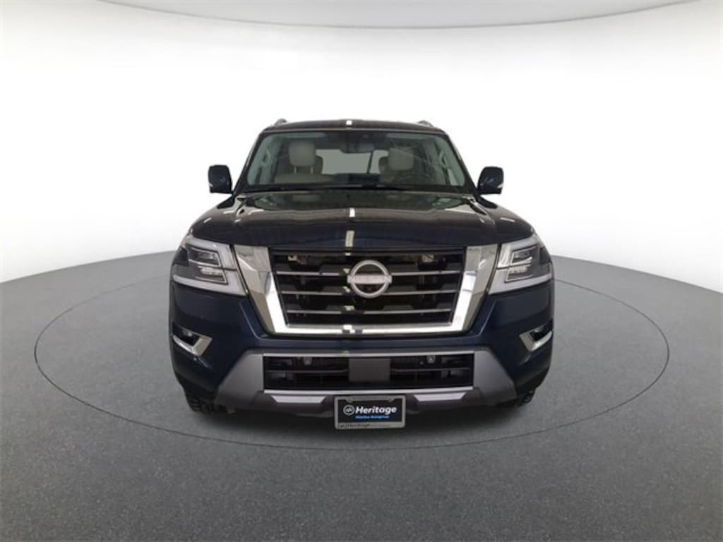 Captain's Chairs Package (2nd Row Captain's Chairs and 2nd Row Center Console w/Padded Armrest), Cargo Package, Balance of Factory Warranty, 4WD, 3rd Row Carpeted Floor Mats - Captain Seat, Alloy wheels, AM/FM radio: SiriusXM, Auto High-beam Headlights, Auto tilt-away steering wheel, Auto-dimming Rear-View mirror, Automatic temperature control, Brake assist, Delay-off headlights, Emergency communication system: NissanConnect Services, Exterior Parking Camera Rear, Front fog lights, Fully automatic headlights, Heated door mirrors, Heated Front Bucket Seats, Heated front seats, Heated steering wheel, Leather-Appointed Seat Trim, Memory seat, Navigation System, Power driver seat, Power Liftgate, Power moonroof, Power passenger seat, Radio: NissanConnect w/SiriusXM, Remote keyless entry, Steering wheel memory, Turn signal indicator mirrors, Wheels: 20" x 8J Painted Alloy, 13 Speakers, 2.937 Axle Ratio, 3rd row seats: split-bench, 4-Wheel Disc Brakes, ABS brakes, Air Conditioning, Anti-whiplash front head restraints, Auto-dimming door mirrors, Auto-leveling suspension, Bumpers: body-color, CONTROL, Cruise Control, Driver door bin, Driver vanity mirror, Dual front impact airbags, Dual front side impact airbags, Electronic Stability Control, Four wheel independent suspension, Front anti-roll bar, Front Bucket Seats, Front Center Armrest, Front reading lights, Garage door transmitter: HomeLink, Illuminated entry, Illuminated Kick Plates, Knee airbag, Leather Shift Knob, Leather steering wheel, Low tire pressure warning, Nissan USB Charging Cable Set, Occupant sensing airbag, Outside temperature display, Overhead airbag, Overhead console, Panic alarm, Passenger door bin, Passenger vanity mirror, Power door mirrors, Power steering, power windows, POWER WINDOWS, Rear air conditioning, Rear anti-roll bar, Rear reading lights, Rear seat center armrest, Rear window defroster, Rear window wiper, Reclining 3rd row seat, Security system, Speed-sensing steering, Speed-Sensitive Wipers, Split folding rear seat, Tachometer, Telescoping steering wheel, Tilt steering wheel, Traction control, Trip computer, Variably intermittent wipers, and Voltmeter.